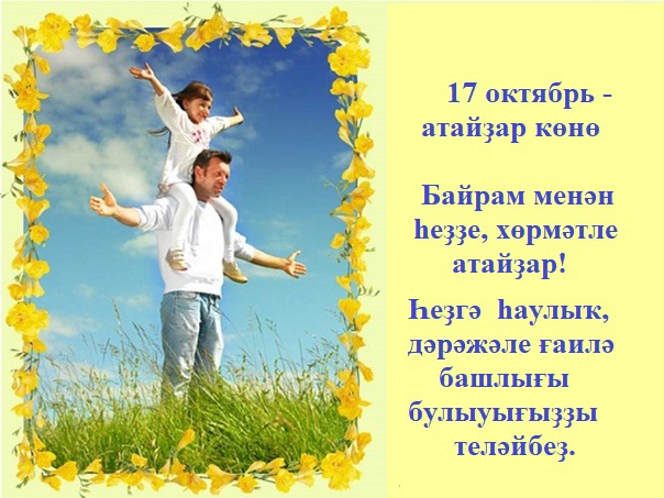 Атайлы бала – арҡалы, тип юҡҡа ғына әйтмәйҙәр. Атайлы үҫкән бала үҙен тормошта ышаныслы тойоп, бер ваҡытта ла юғалып ҡалмай. Атай кеше – ғаиләнең дә, илебеҙҙең дә терәк-таянысы. Хөрмәтле атайҙар, бөгөнгө байрамығыҙ менән! Киләсәктә лә ҡәҙерле кешеләрегеҙҙең, балаларығыҙҙың, тыуған төйәгебеҙҙең яҡлаусыһы, ҡурсалаусыһы булып ҡалығыҙ.
